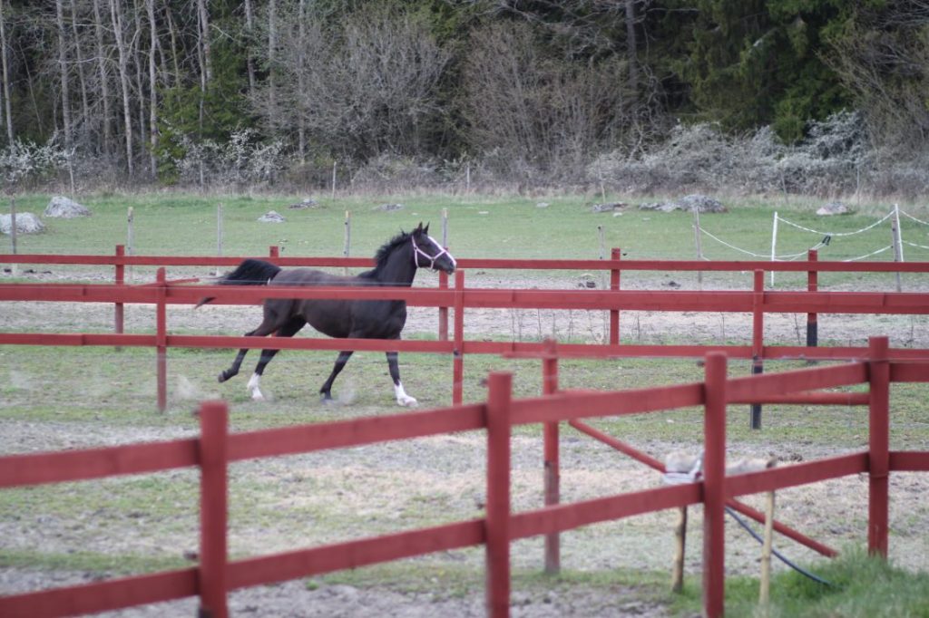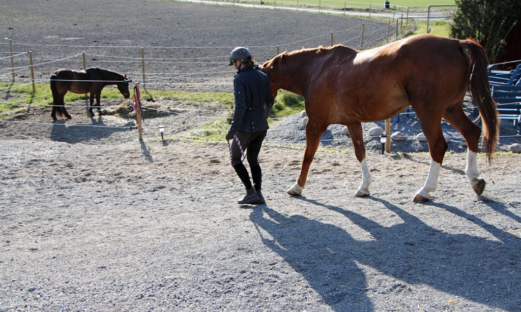 Morgonutfodringen på ridskolan är nu avslutad. Alla hästarna har ätit upp sitt grovfoder och ska släppas ut i hagarna. På Nytorps ridskola är man noga med säkerheten. Hästar är flyktdjur och även om de oftast är lugna och snälla kan de bli rädda och försöka slita sig från skötaren. Alla hästar som leds ut till hagen är utrustade med grimma och grimskaft och den person som leder ska ha hjälm, handskar och kraftiga skor.