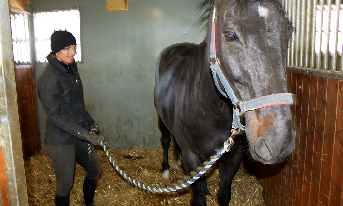 Lotta har jobbat 13 år på Nytorps ridskola. I hennes jobb ingår både att hålla ridlektioner och att ha ansvar för hästarna och ponnyerna. Hon känner varje fyrbent vän i stallet och njuter av de morgnar hon är först på plats. För Lotta är hästarnas hälsa det allra viktigaste, flera av dem gnäggar välkomnande så snart hon kommer in i stallet. När Lotta går runt med den första grovfodergivan tittar hon så alla har ätit upp fodret från kvällen innan. Hon registrerar också att hästarna rör sig som vanligt i boxarna och hur träckhögarna ser ut.