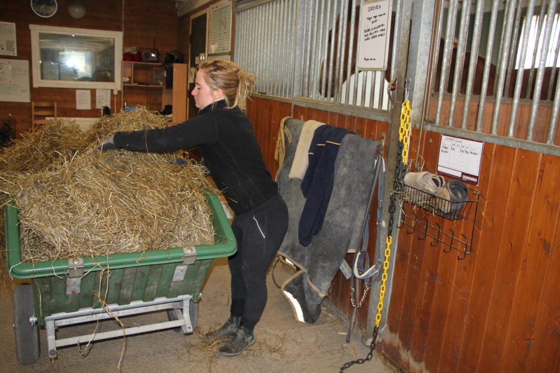 – Javisst, jag tar hand om det, säger Veronica och drar vagnen med grovfoder vidare genom stallet.